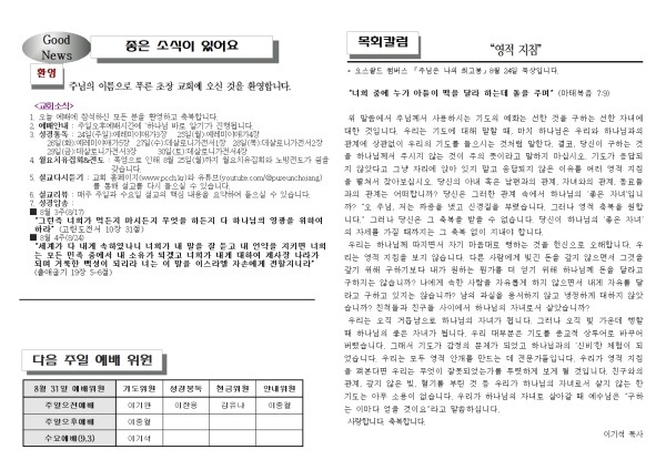 2025년 8월 17일 푸른초장교회 주보