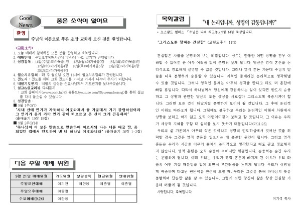 2025년 9월 21일 푸른초장교회 주보