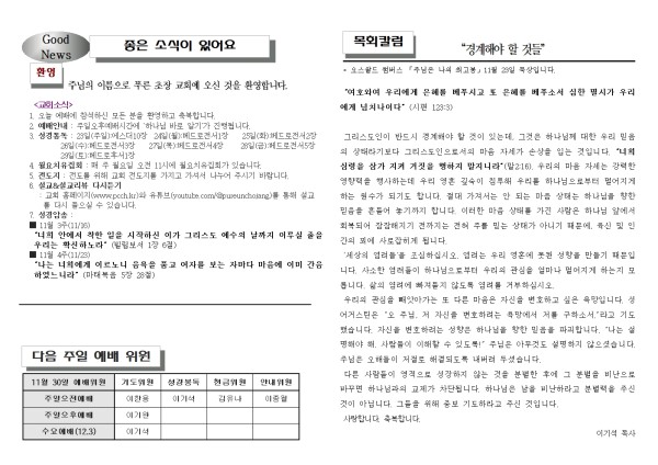 2025년 11월 30일 푸른초장교회 주보