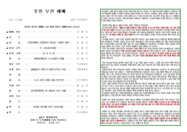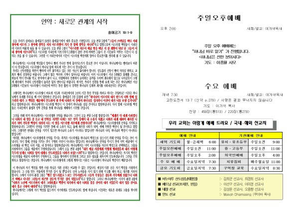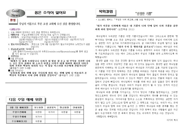 2025년 9월 7일 푸른초장교회 주보